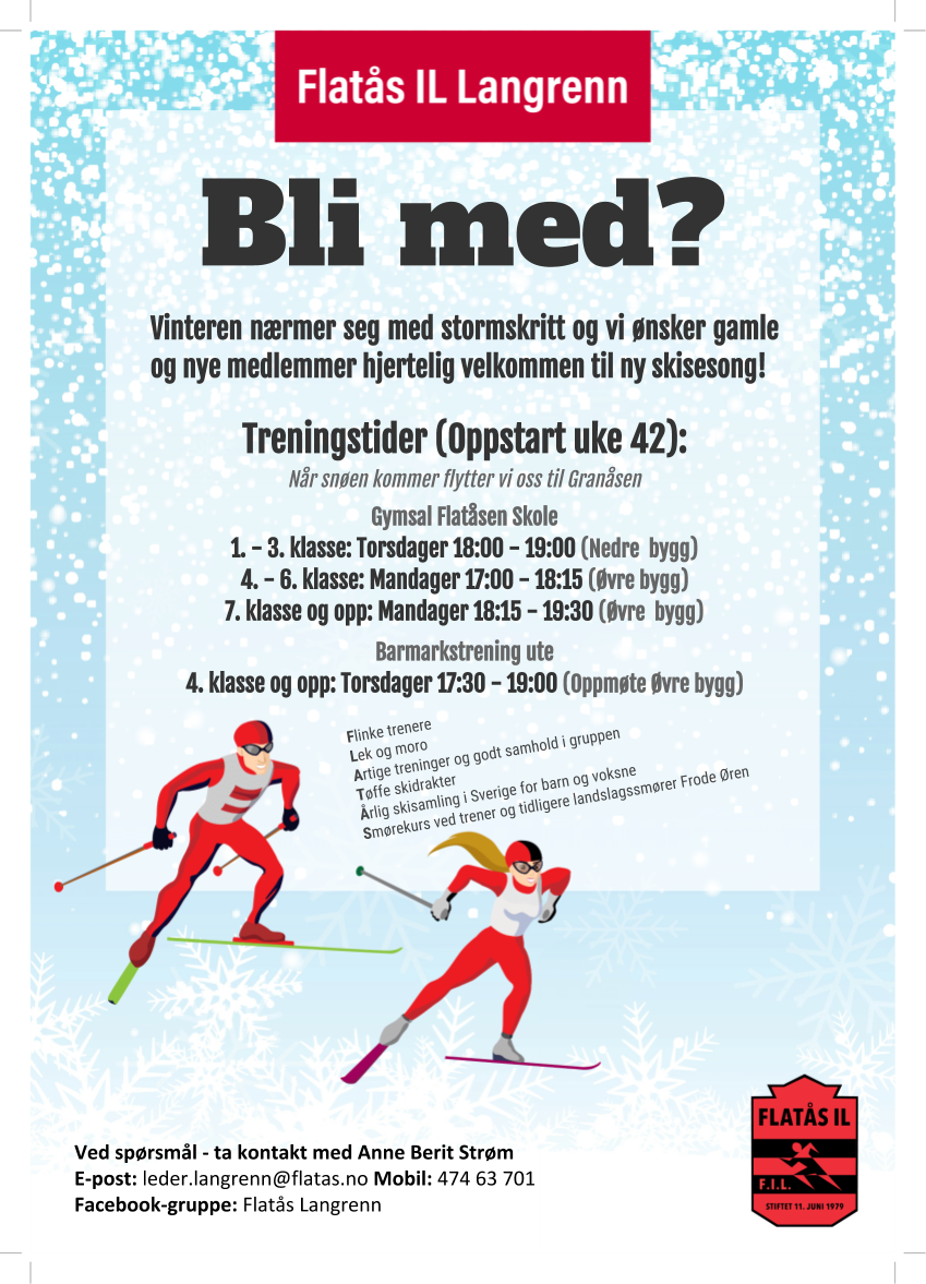 Velkommen til Flatås Langrenn. Flatås IL er en aktiv skigruppe fra 1. klasse og oppover. Vi har trening en gang i uka i vinterhalvåret fra ca høstferie til påskeferien. På høsten starter vi opp med barmarkstrening (leker, stafetter og mer målrettet trening for de eldre) og flytter oss over til skianlegget i Granåsen eller Saupstad så snart snøen kommer. Les mer om oss og hvordan bli med.